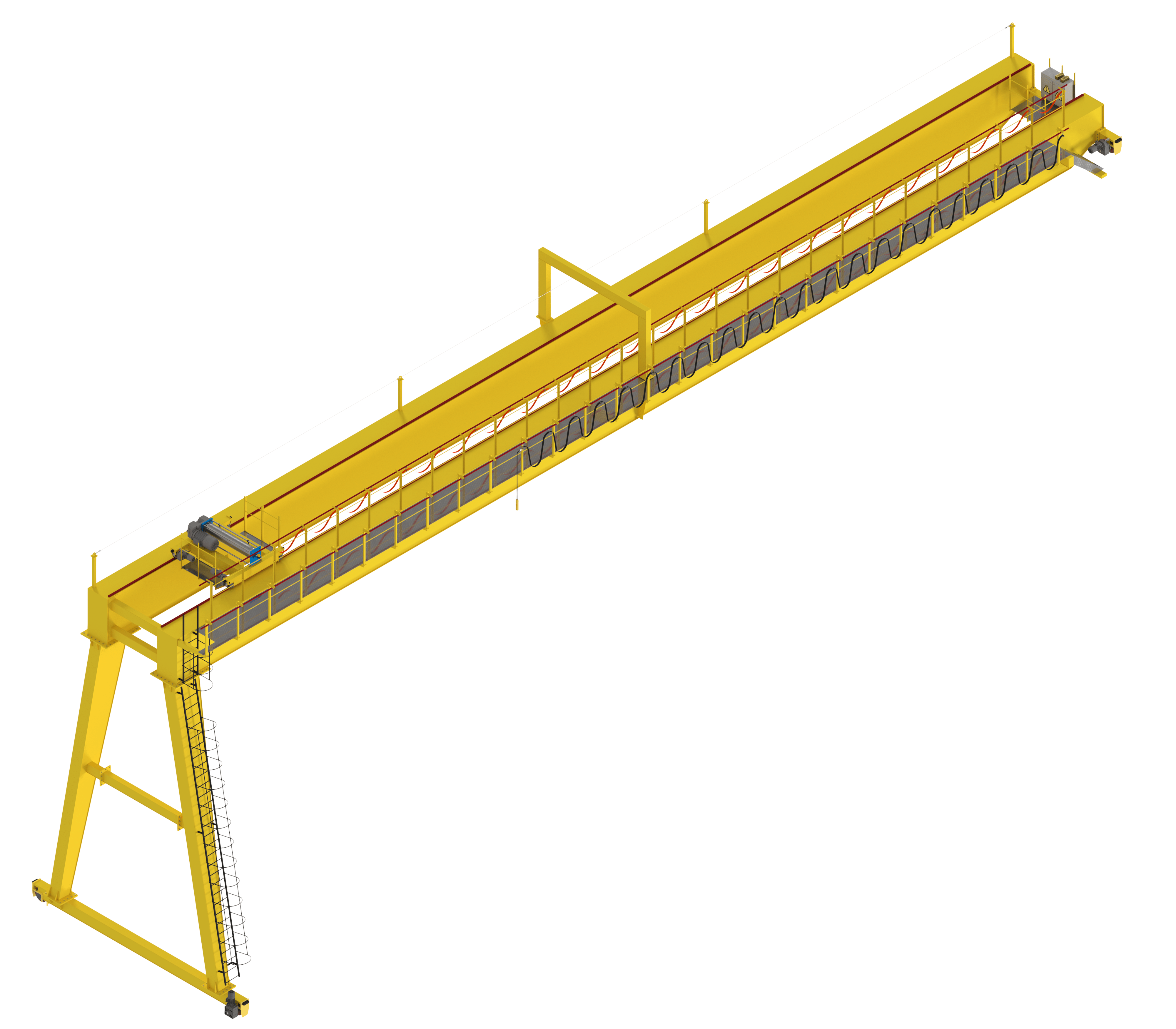 This type of crane can be designed and manufactured from 2 to 80 tons in tonnage and 6 to 40 meters in span with consoles on both sides as a pair of girders and a single girder. The most important feature of these cranes is their use in open environments. The crane structures are designed according to the Din4132 and AWS D14-1 standards and are manufactured according to the latest technology in equipped workshops. The materials used in these cranes are S235JR-S275JR-S355JR. Gantry cranes are the best choice for open spaces. Also, for spaces where the hall structure cannot install a lift or where a lift is needed that is not dependent on the hall structure and, in other words, is independent of the hall; a gantry crane can be used. The movement of this crane is on ground rails. Due to the independence of this type of gantry crane from the hall structure, this crane is of great interest to various industries, including shipping, mining, and open-air warehouses.